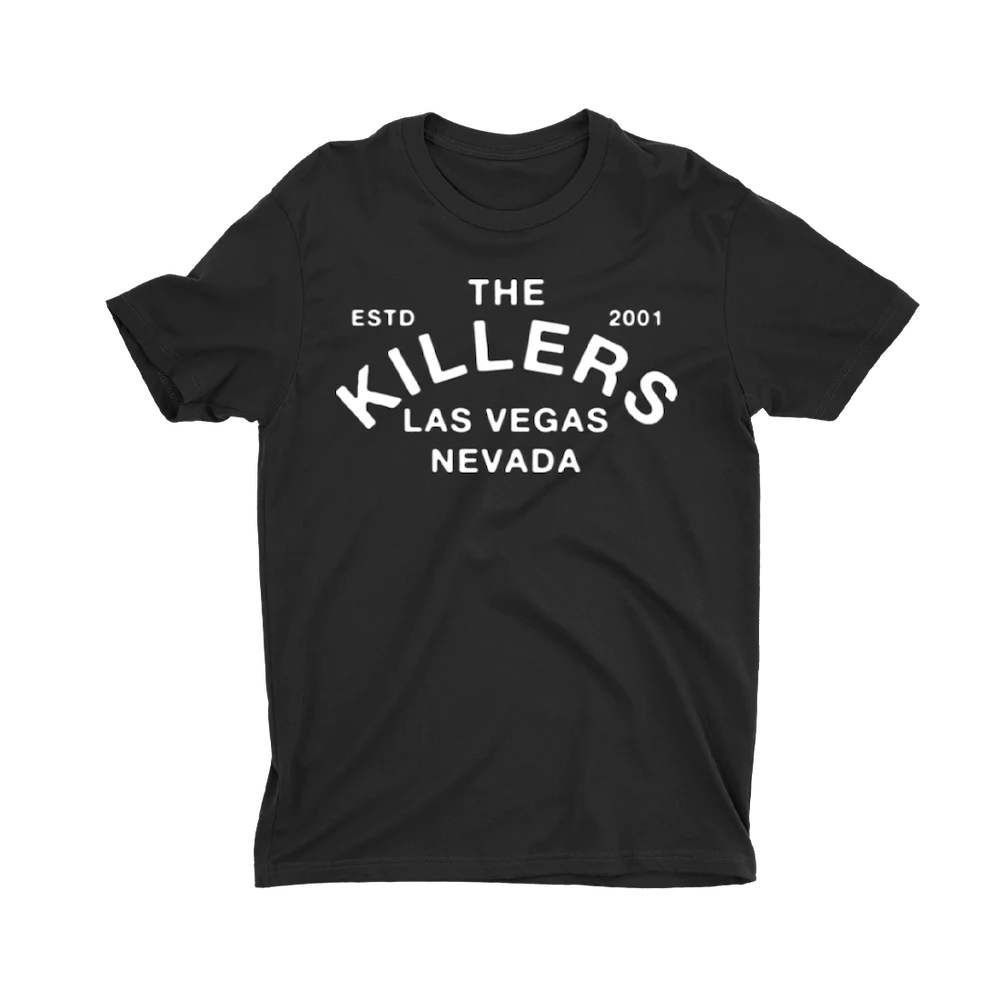 BLACK T-SHIRT FEATURING THE KILLERS LAS VEGAS GRAPHIC ON FRONT.