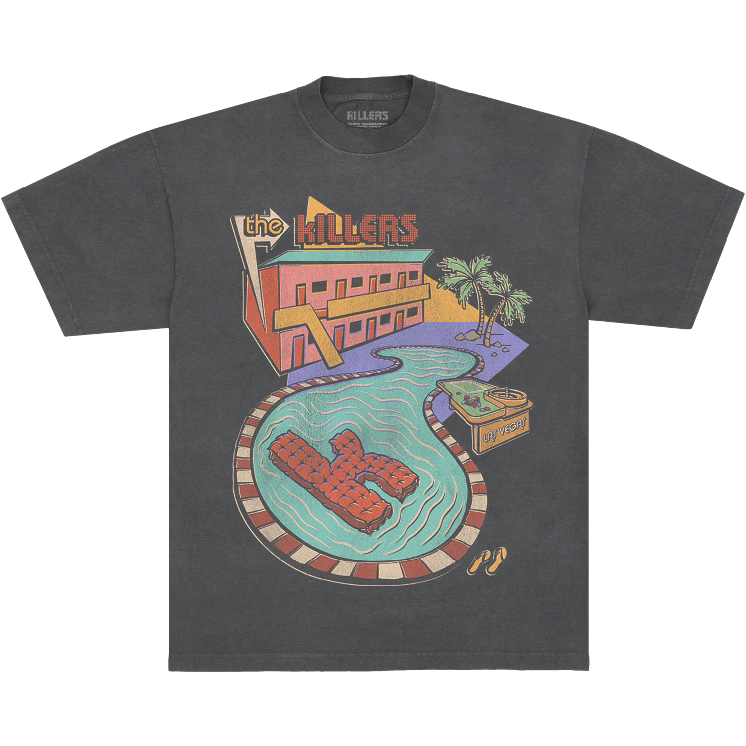 A pepper unisex tee with The Killers motel pool graphic printed on the front.